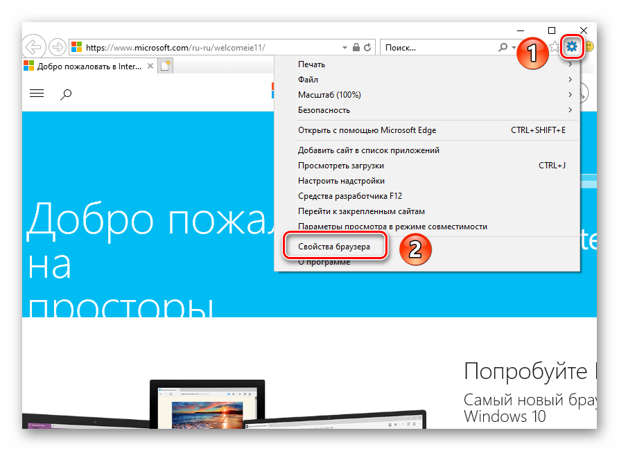Запустится обозреватель. В правом верхнем углу нажмите на кнопку с изображением шестеренки, затем в появившемся меню выберите строчку «Свойства браузера».