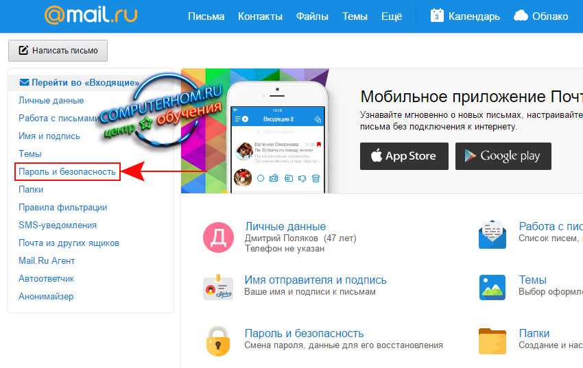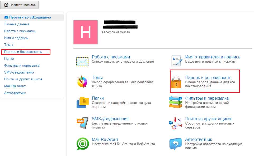 Через пару секунд откроется новая страничка. Здесь вы можете настроить свой почтовый ящик как душе угодно. Установить различные фильтры для сообщений, указать номер телефона, отредактировать личные данные и даже создать дополнительные папки для сообщений, у которых будет отдельный пароль. Но в данном случае нам нужно выбрать тот пункт меню, который отвечает за смену пароля. Значит жмем на «Пароль и безопасность».