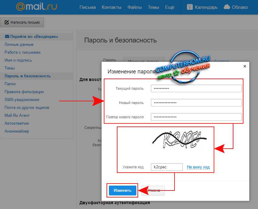 Перед вами сразу же появится новое окошко, к котором будет предложено ввести нужные данные. Здесь напишите тот пароль, который у вас сейчас, а затем два раза нужно указать новый. Но помните, вам не удастся в качестве нового пароля указать что-то простенькое, к примеру пару цифр. Так как сайт не примет слишком легкий пароль. Придется хорошенько подумать. А далее просто указываем в самом низу код с картинки и жмем «Изменить».