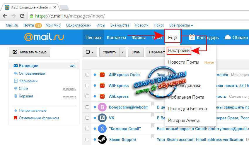 И так вы уже вошли к себе в почтовый ящик. Значит перед глазами наблюдаете вот такую картину. Далее жмете на кнопку «Еще» а в появившемся окне кликаем на кнопку «Настройки».