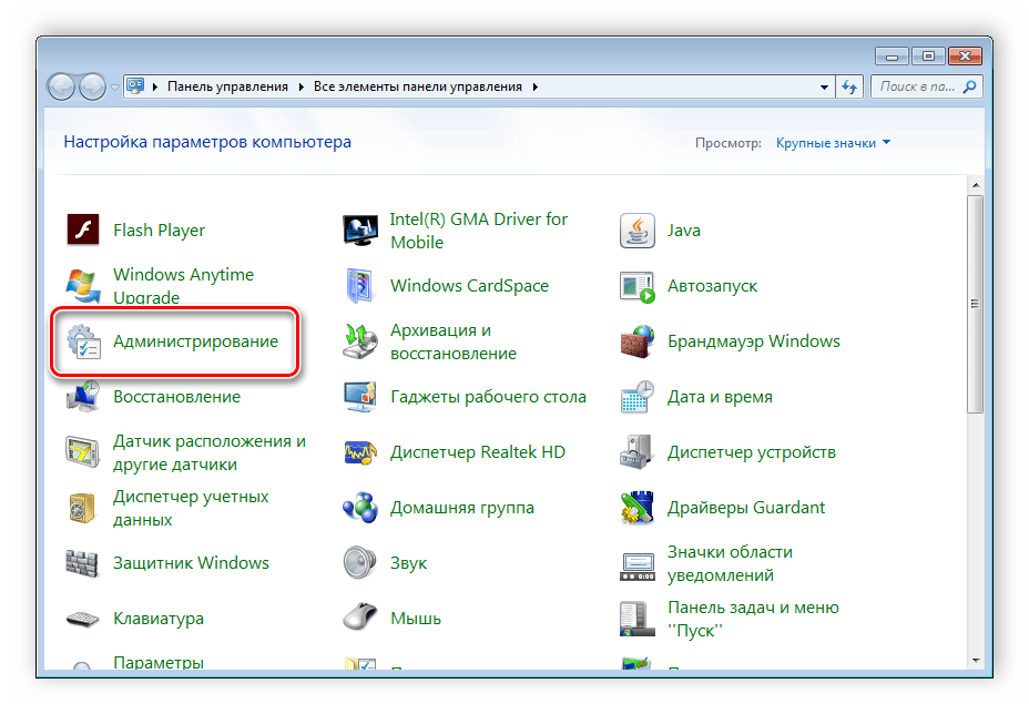 Зайти в «Администрирование».