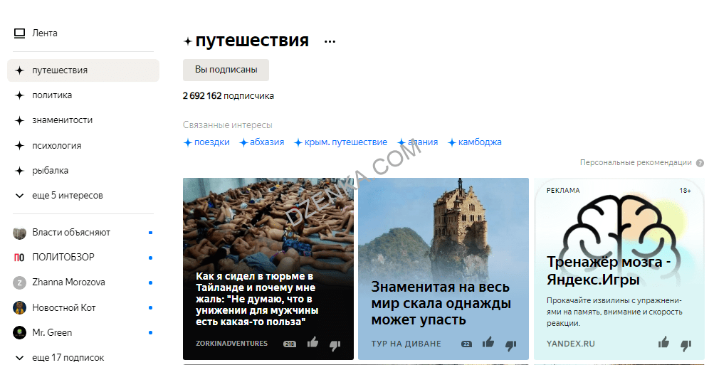 После подписки Дзен начнет показывать подобные тематики с других каналов или сайтов.