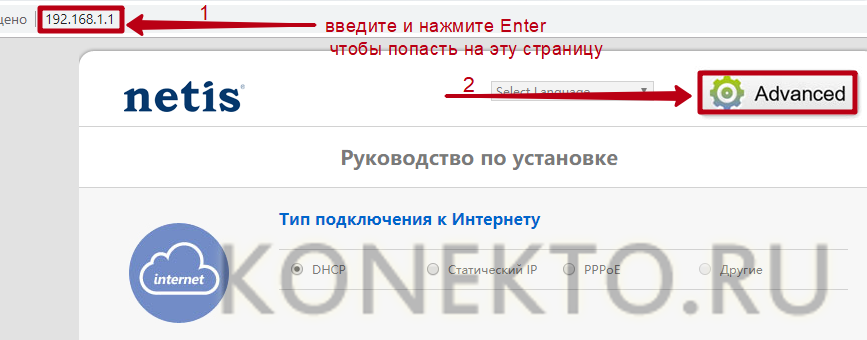 Ввести IP в адресную строку своего браузера и нажать Enter. На открывшейся странице кликнуть по кнопке «Advanced» для перехода к расширенным настройкам (название может отличаться в зависимости от модели маршрутизатора).