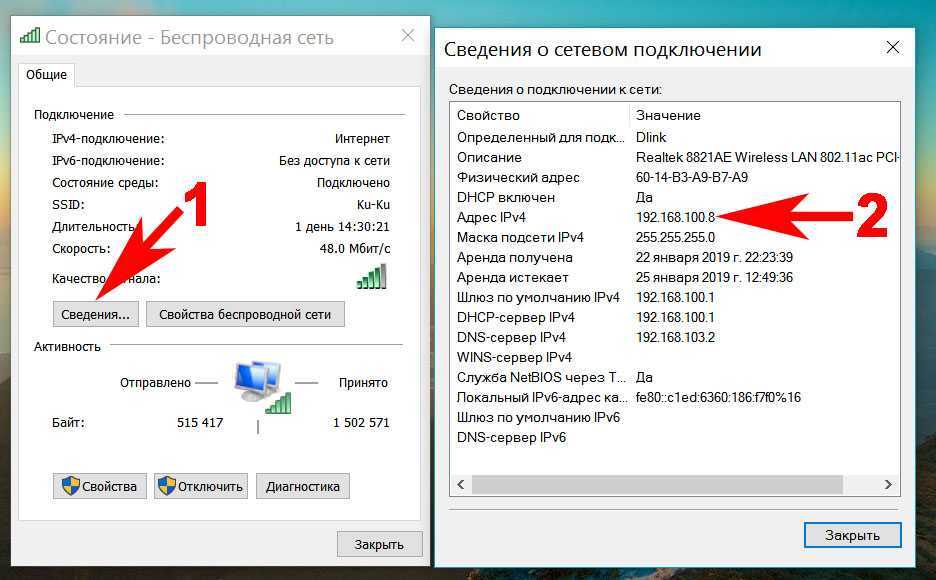 - Нажмите на кнопку «Сведения» и найдите в появившемся списке строку «Адрес IPv4». В ней будет указана нужная вам информация.