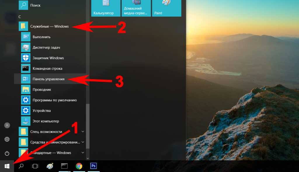 - Сначала нажать на Пуск и перейти в Панель управления.