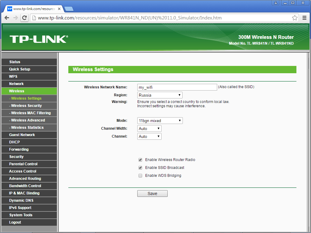 Шаг.5 Вам необходимо настроить беспроводную сеть, для этого выберите раздел «Wireless» в левой части экрана, откройте подраздел «Wireless Setting» (настройки беспроводной сети). Нужна только графа «Wireless Network Name» — это имя сети, название которой вы должны придумать самостоятельно (Название может содержать латинские буквы и цифры, без кириллицы). В поле «Region» (в некоторых версиях «Location») выберите Russia. Сохранитесь.