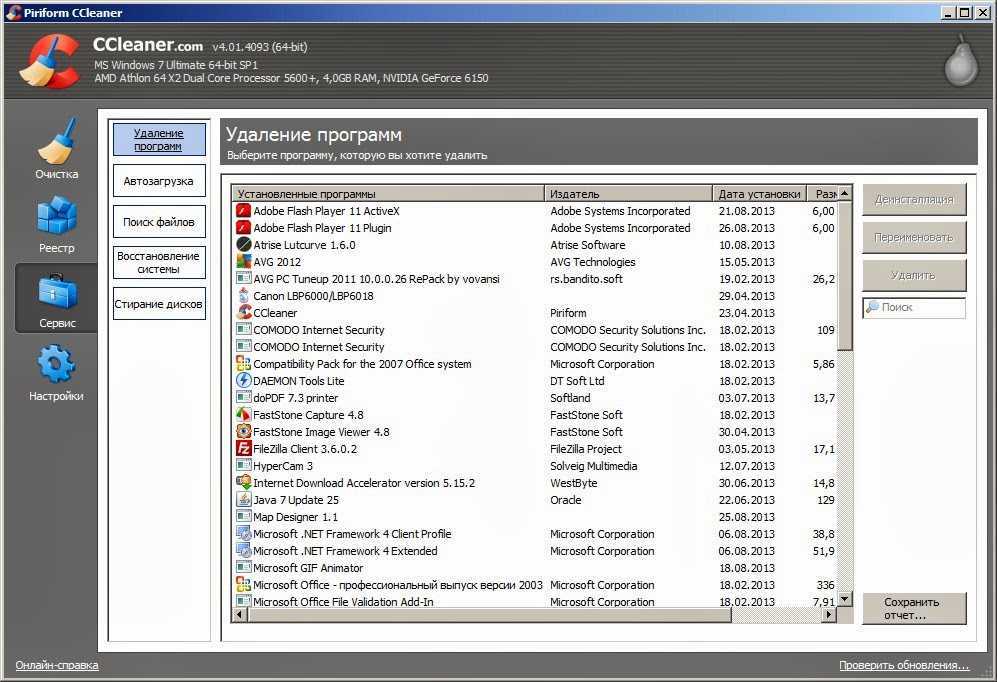 Лишние файлы удаляются также программой CCleaner, скачивается она на официальном сайте. В утилите есть возможность проанализировать пространство диска, удалить ненужные файлы и почистить реестр, а также настроить автозагрузку во вкладке «Сервис».