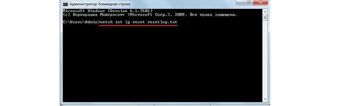 Пишем там следующее: «netsh int ip reset resetlog.txt» так как показано на рисунке. Нажимаем Enter и перезагружаем компьютер.