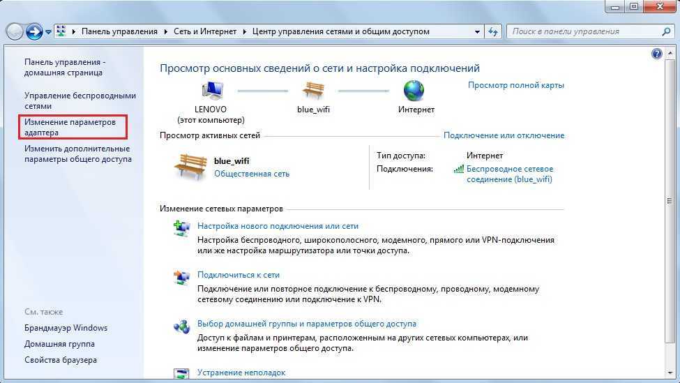 Пункт «Изменение параметров адаптера» в «Центре управления сетями и общим доступом»