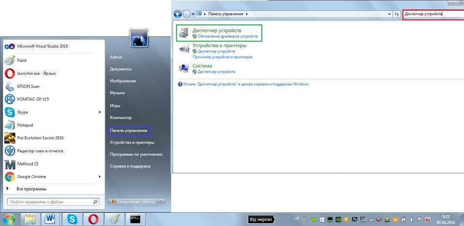 Заходим в диспетчер устройств. Для этого в меню «Пуск» запускаем «Панель управления» (показана синим цветом на рисунке). После этого в строке поиска (выделена красным) пишем «Диспетчер устройств». Запускаем тот, возле которого написано «Обновление драйверов устройств» (выделен зеленым).