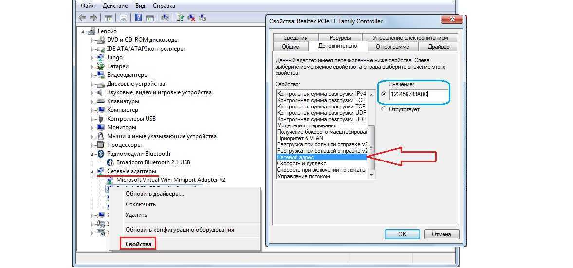 В диспетчере находим пункт «Сетевые адаптеры» (на рисунке он подчеркнут), на своем (там могут быть дополнительные – виртуальные, но на виртуальных обычно написано «Virtual») кликаем правой кнопкой мыши и выбираем пункт «Свойства» (выделен красным). В открывшемся меню переходим на вкладку «Дополнительно», находим в списке пункт «Сетевой адрес» и в поле «Значение» (выделено синим) пишем любую 16-разрядную цифру на 12 знаков. Можно написать такую, как показано на рисунке. Нажимаем «ОК».