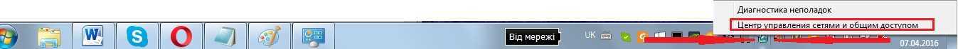 Зайти в «Центр управления сетями и общим доступом». Делается это очень просто – нужно кликнуть правой кнопкой мыши на пиктограмме подключения к сети в панели быстрого запуска. После этого выбрать желаемый пункт. Выглядит все это так, как показано на рисунке.