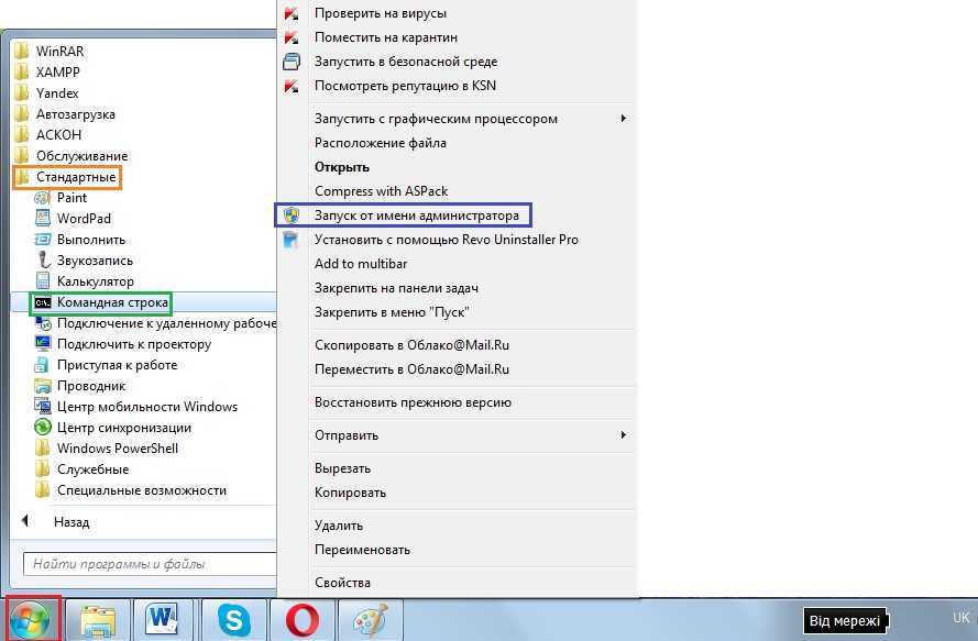 Попробуем? Нам надо вызвать командную строку, для чего мы идем в «Все программы > Стандартные». Находим «Командную строку», кликаем по пункту правой кнопкой мыши и выбираем «Запуск от имени администратора».