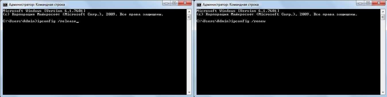 Ввод команд «ipconfig /release» и «ipconfig /renew» в командную строку