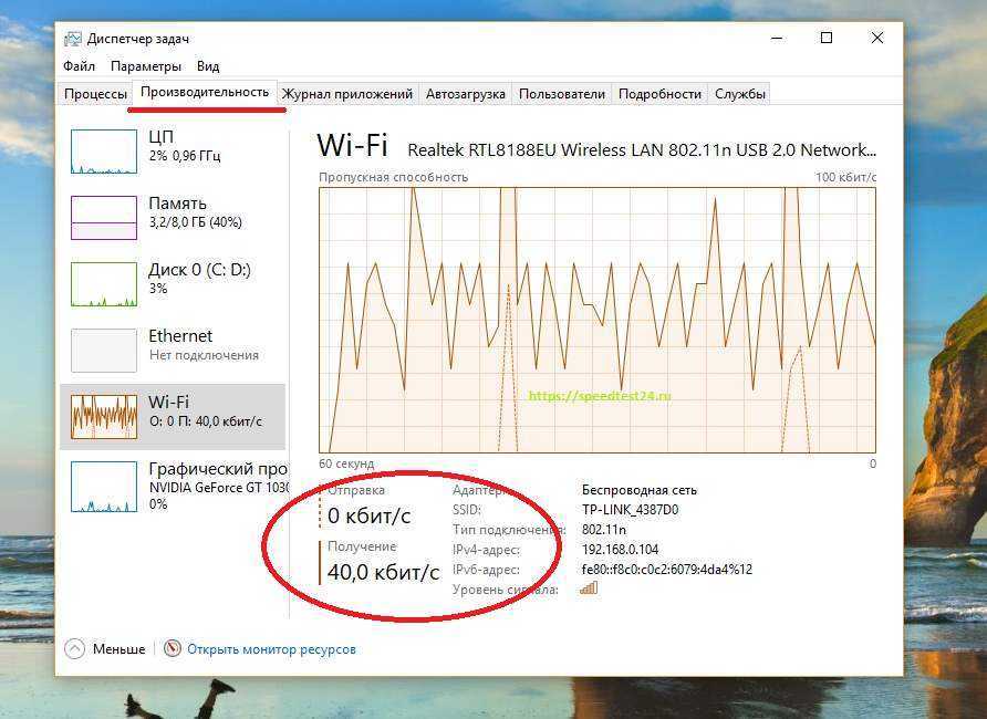 В диспетчере задач переходим на вкладку “Производительность” и выбираем пункт WI-FI или Ethernet