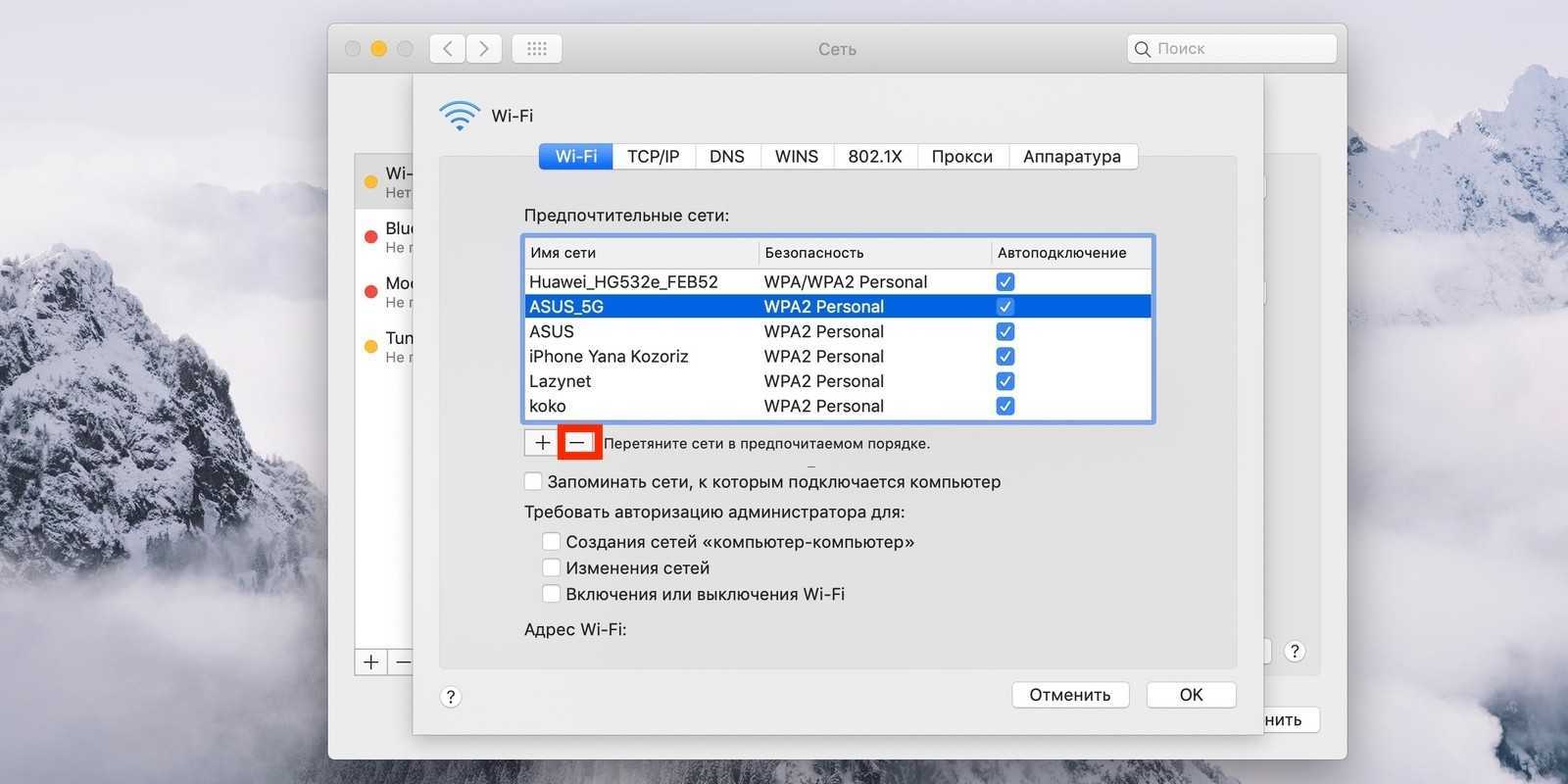 Выберите ту, к которой не получается подключиться и кликните по кнопке «-«.