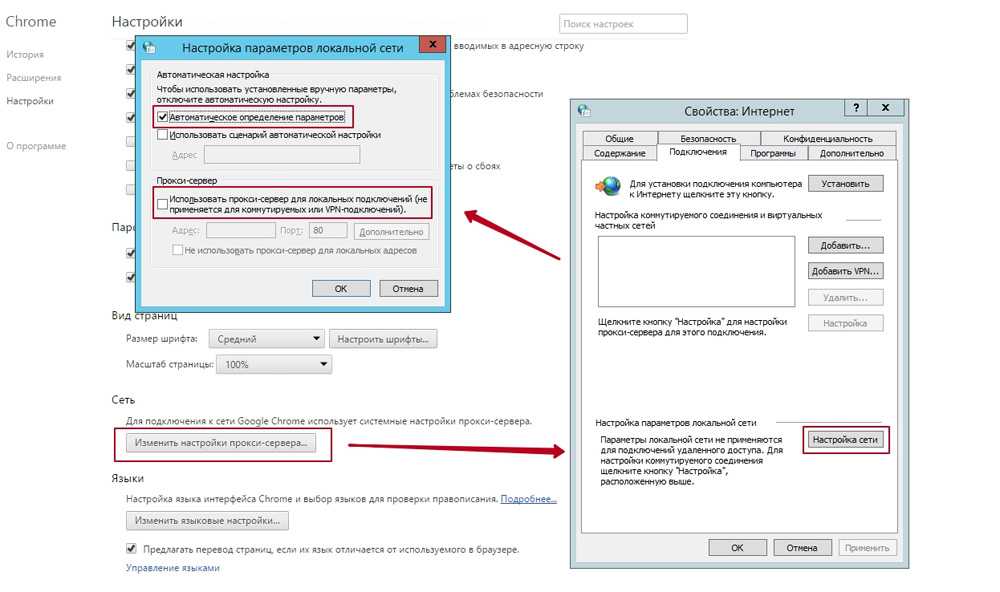 В тех случаях, когда используется Google Chrome, следует войти в его основные настройки, после чего перейти к корректировке дополнительных настроек, обнаружив параметр «Изменить настройки прокси-сервера» в группе «Сеть». Кликнув по выбранному параметру, появится новое окно с несколькими вкладками, среди них следует выявить «Подключения», а затем перейти на неё. Затем внизу нового окна, возникшего на экране, будет расположен параметр «Настройка сети», по нему также следует кликнуть. Теперь откроется другое новое окно, где будет установлена птичка напротив фразы «Использовать прокси-сервер для локальных подключений». Вот как раз эту птичку следует убрать, а поставить её вверху, напротив фразы «Автоматическое определение параметров». Остаётся теперь согласиться с внесёнными изменениями, нажимая «OK» при каждом закрытии окон.