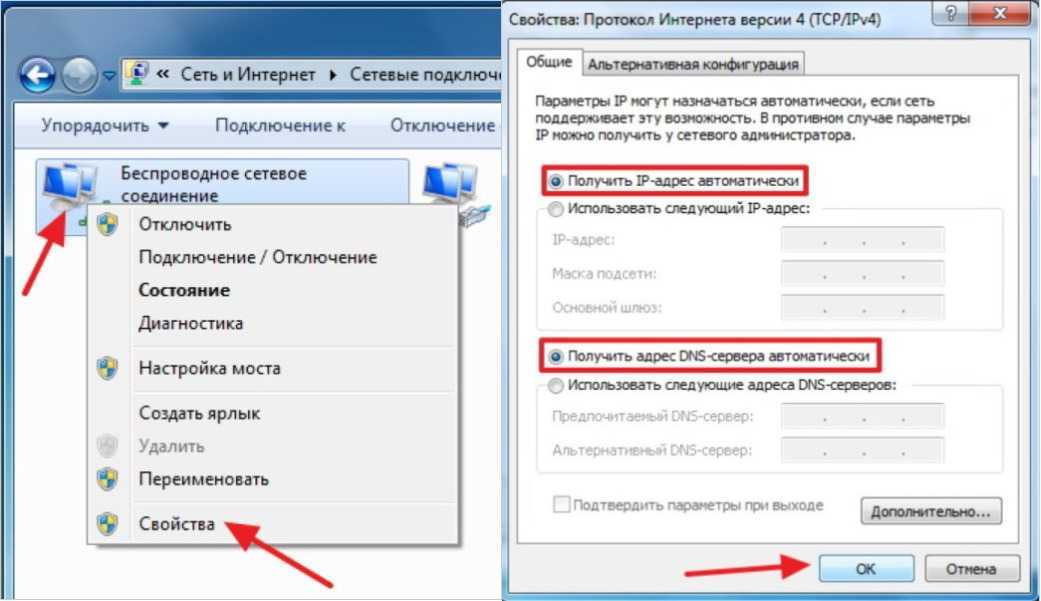 Здесь необходимо поставить автоматическое получение IP-адреса и DNS-серверов. Нажимаем кнопку ОК по очереди в обоих окошках и проверяем доступ.