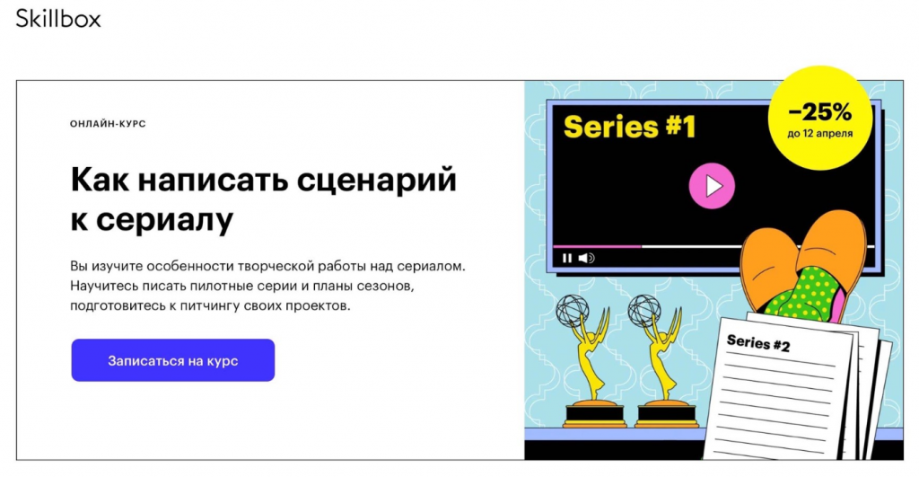 | Как написать сценарий к сериалу | от 5 625 ₽/мес | Онлайн-уроки | 4 месяца | Skillbox |