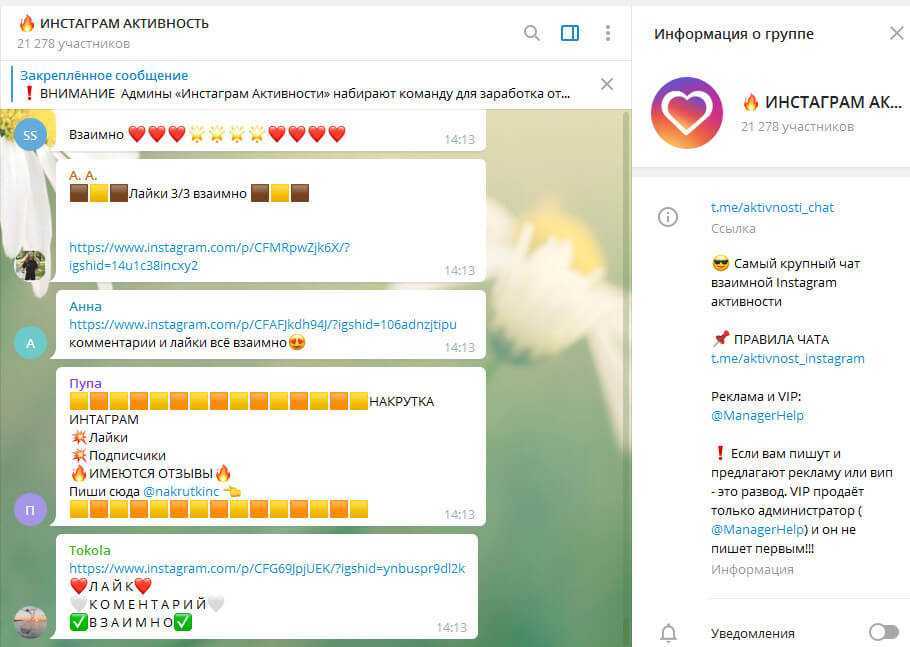 Другой вариант – чаты активности. Они есть в Инстаграм, Telegram, WhatsApp и Viber. Это способ набрать ответы и лайки к фото от живых пользователей. Необходимо выполнить действия как минимум для трех пользователей, чтобы получить взаимные реакции. Если задания не выполнять, в чате заблокируют. Также за слишком активную деятельность в чужих профилях на ваш аккаунт могут наложить временный бан.