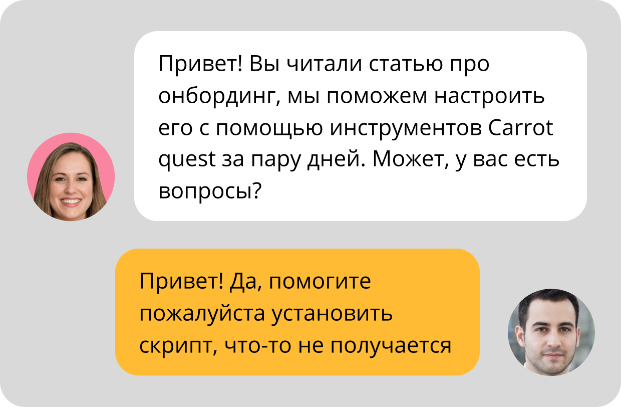 Хорошая идея — проактивно начать диалог и вовлечь клиентов в коммуникацию. В Carrot quest можно гибко настраивать условия для триггерных сообщений в чате, чтобы делать релевантные предложения пользователям. Например, предложить консультацию, если человек долго бездействует во вкладке с товаром.