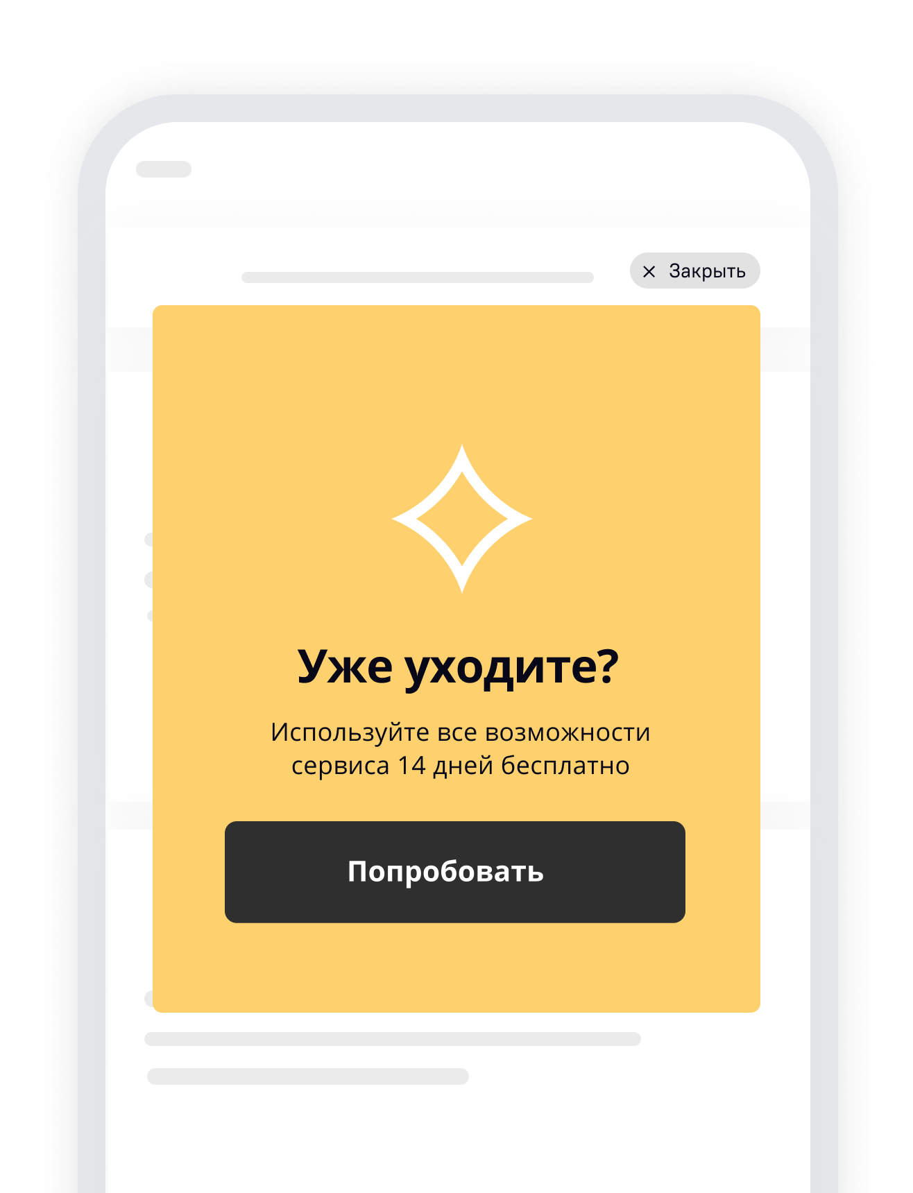 С помощью поп-апов можно удержать пользователя в момент ухода: предложить бесплатный триал или другую ценность продукта.