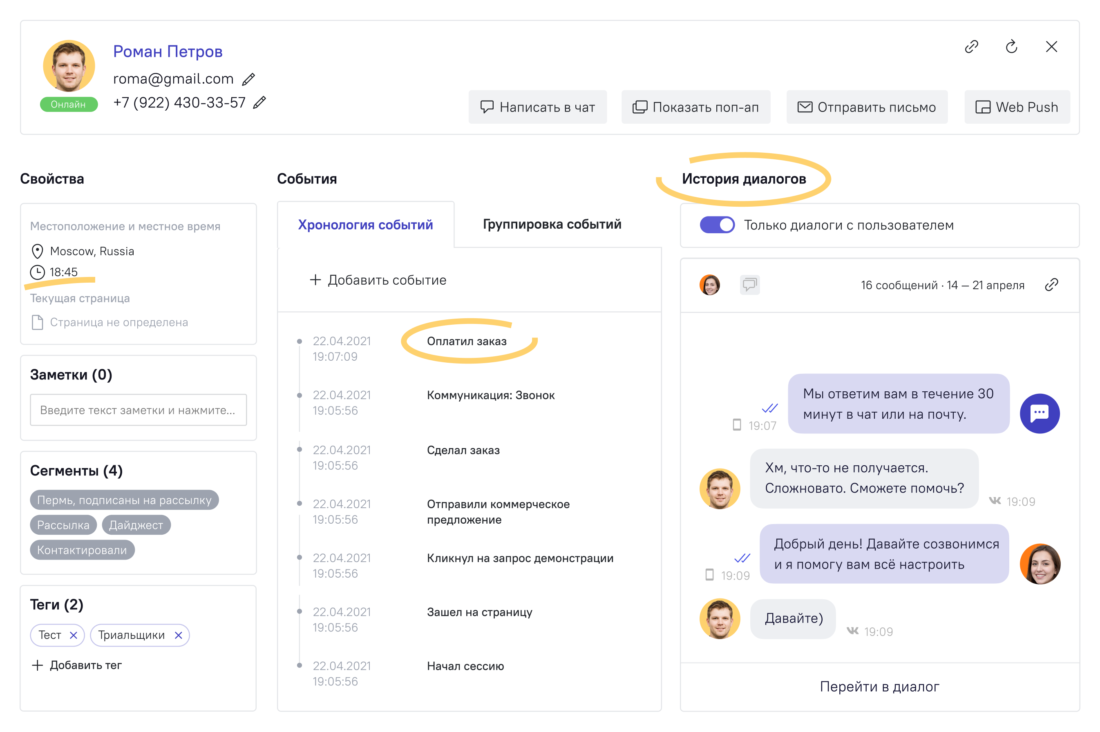 Помогает отслеживать интересы, действия и свойства пользователей, чтобы персонализировать коммуникацию с ними. Все данные собираются в индивидуальную карточку пользователя и хранятся в единой базе лидов из мобильного приложения и с сайта.