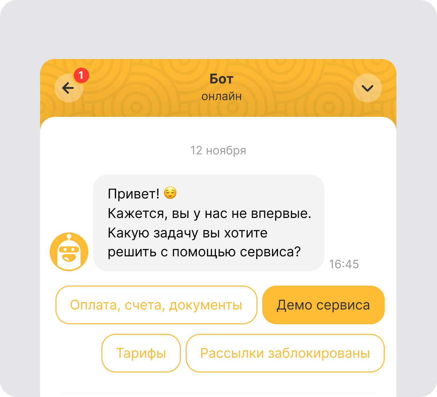 Люди, которые быстро получают ответы на вопросы, становятся лояльными и решаются на покупку быстрее. Welcome-бот помогает пользователю разобраться в базовых вопросах и разгружает операторов поддержки. От триггерных сообщений welcome-бот отличается тем, что начинает работать, когда пользователь сам открывает диалог.