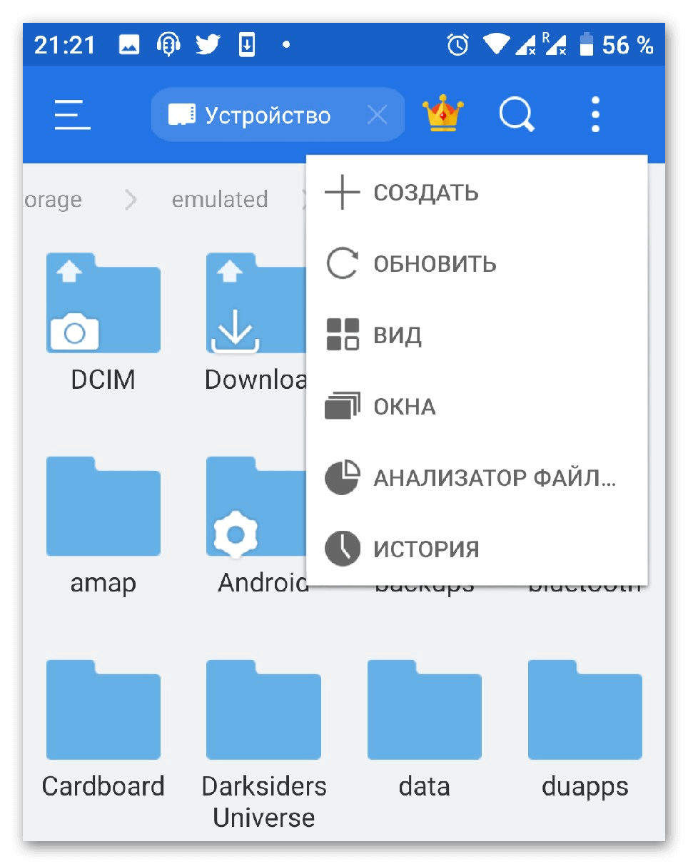 Приятный менеджер с сортировкой файлов по нескольким категориям в зависимости от формата. Нажимаем на синюю кнопку. Из контекстного меню выбираем «Новая папка» и присваиваем ей имя.
