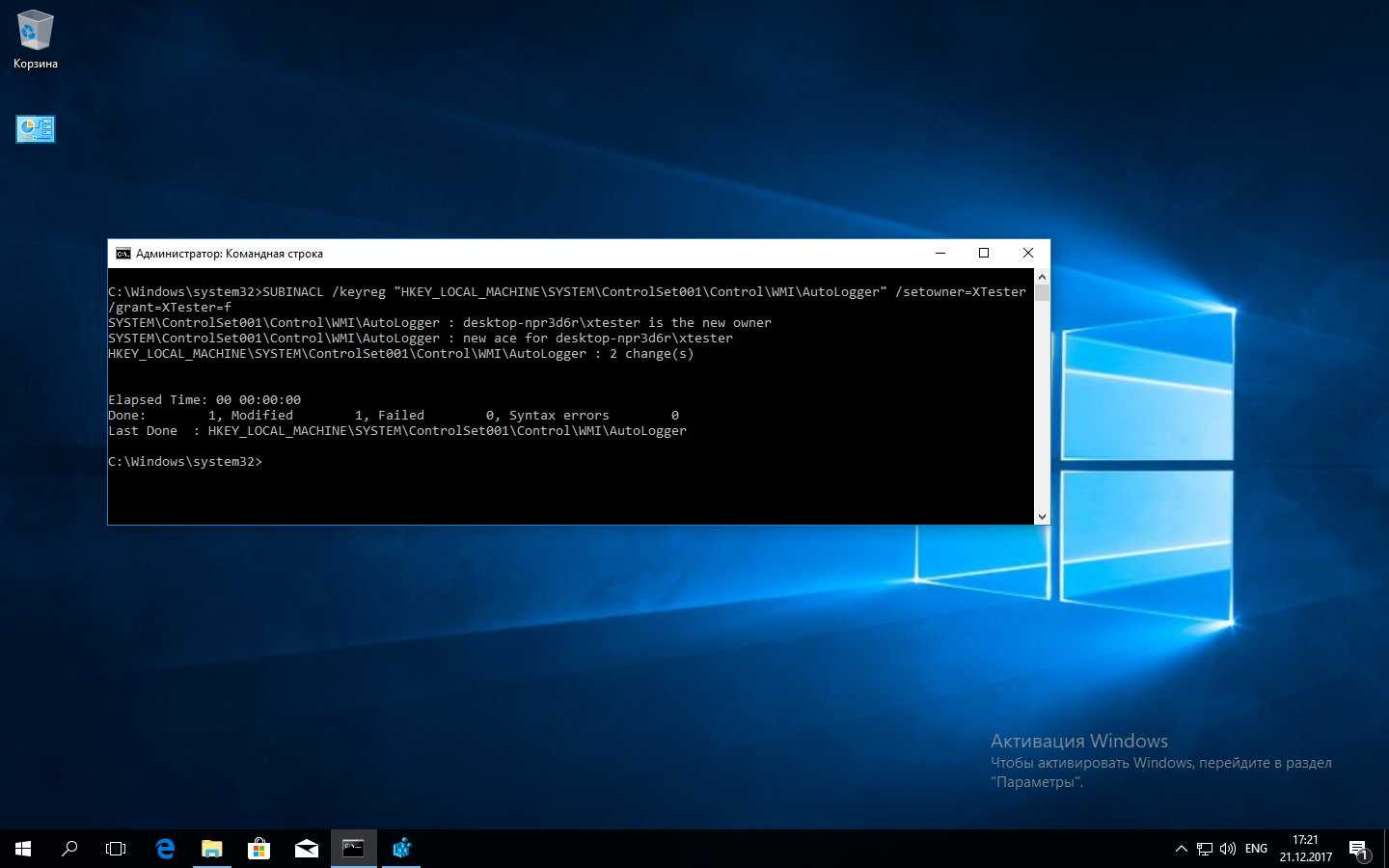 Как обычно: прежде чем назначать права объекту, нужно стать его владельцем. Два действия легко объединить в одну команду, перечислив их через пробел. Например, следующая команда сначала сделает группу «Администраторы» владельцем ключа AutoLogger (он отвечает за трассировку событий, происходящих на начальных этапах загрузки ОС), а затем предоставит админам полный доступ к нему.