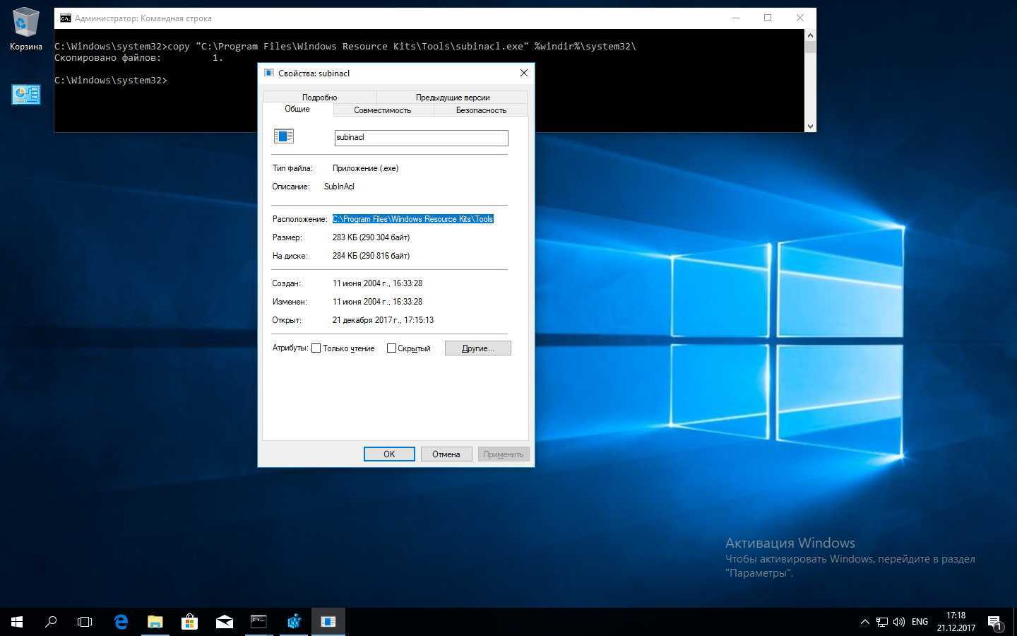 Копируем SubInACL в системный каталог