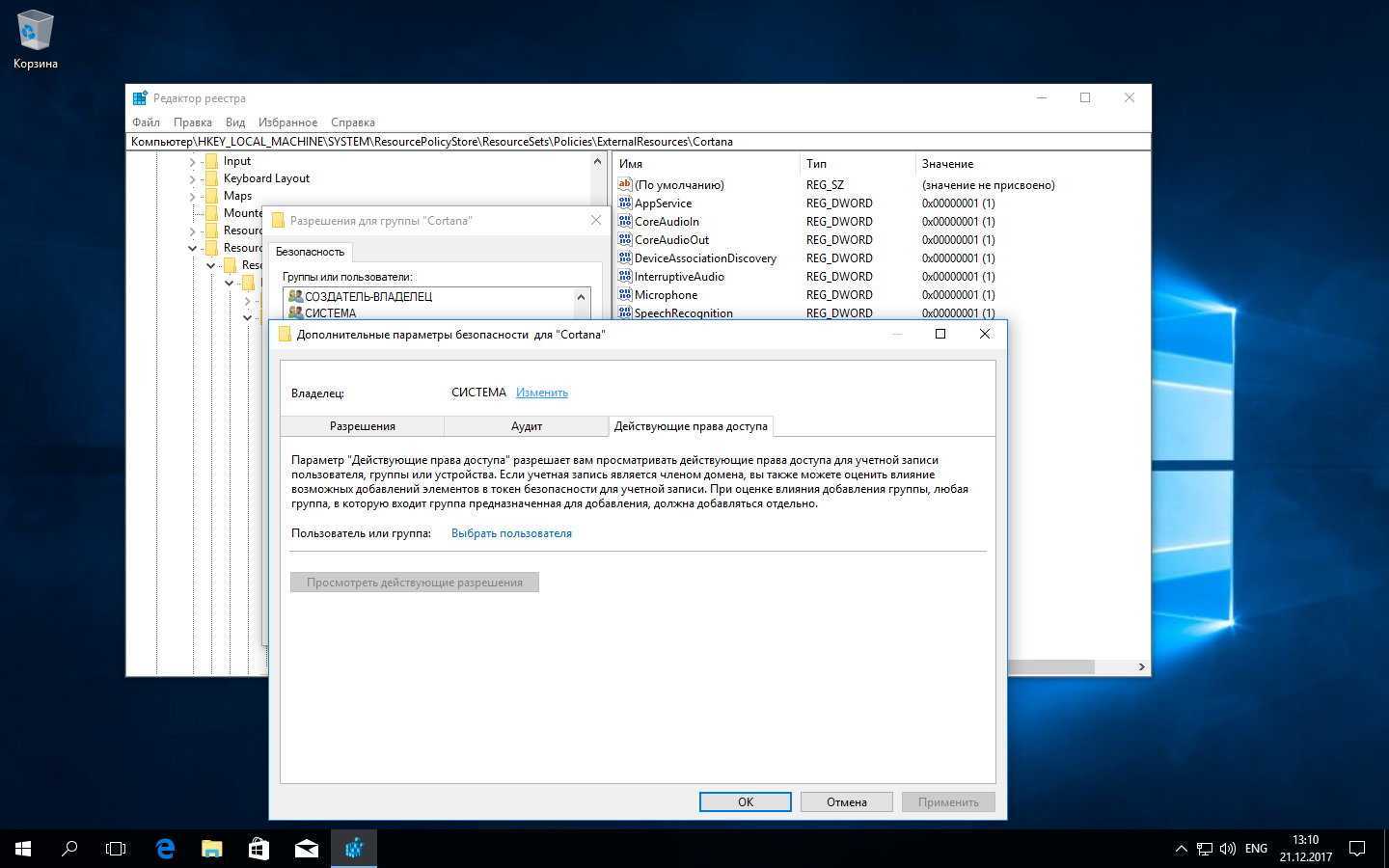 Задаем разрешения для изменения настроек Кортаны