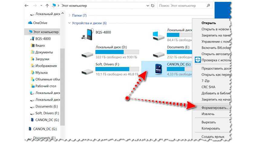 - Найдя карту памяти, нужно нажать на ней правой кнопкой мыши и в появившемся контекстном меню выбрать пункт .