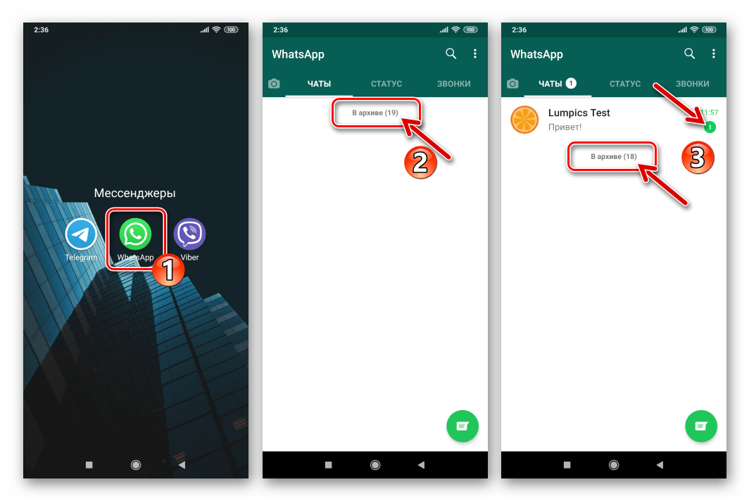 В WhatsApp для Android разархивация диалогов и групп может производиться путём прохождения одного из нескольких коротких путей. Эффект от выполнения той или иной инструкции принципиально не отличается, поэтому выбираем тот метод, который кажется более удобным и быстрым в той или иной ситуации.