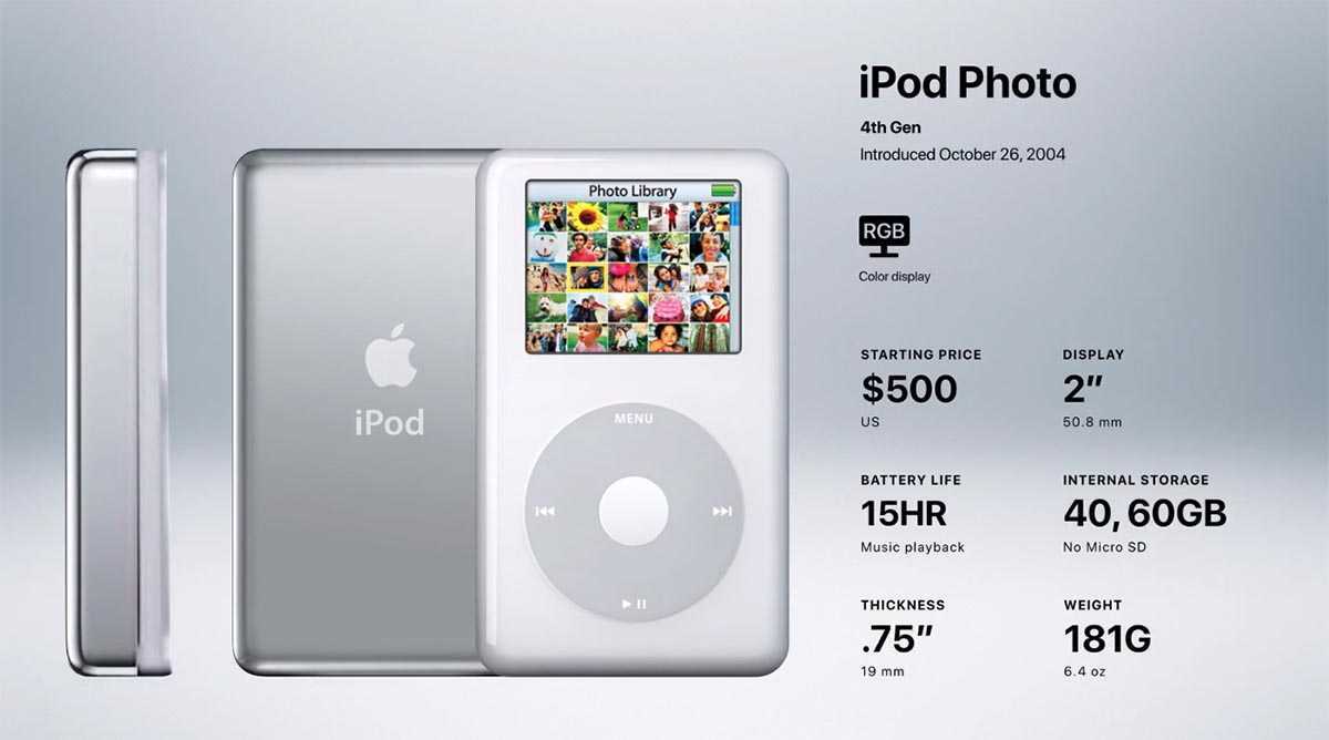 Не самым удачным ответвлением основной линейки плееров стал iPod Photo. Это все тот же iPod Classic 4-го поколения, но с цветным RGB-дисплеем. Разработчики полагали, что пользователи захотят загружать и просматривать собственные снимки на небольшом 2-дюймовом экране.