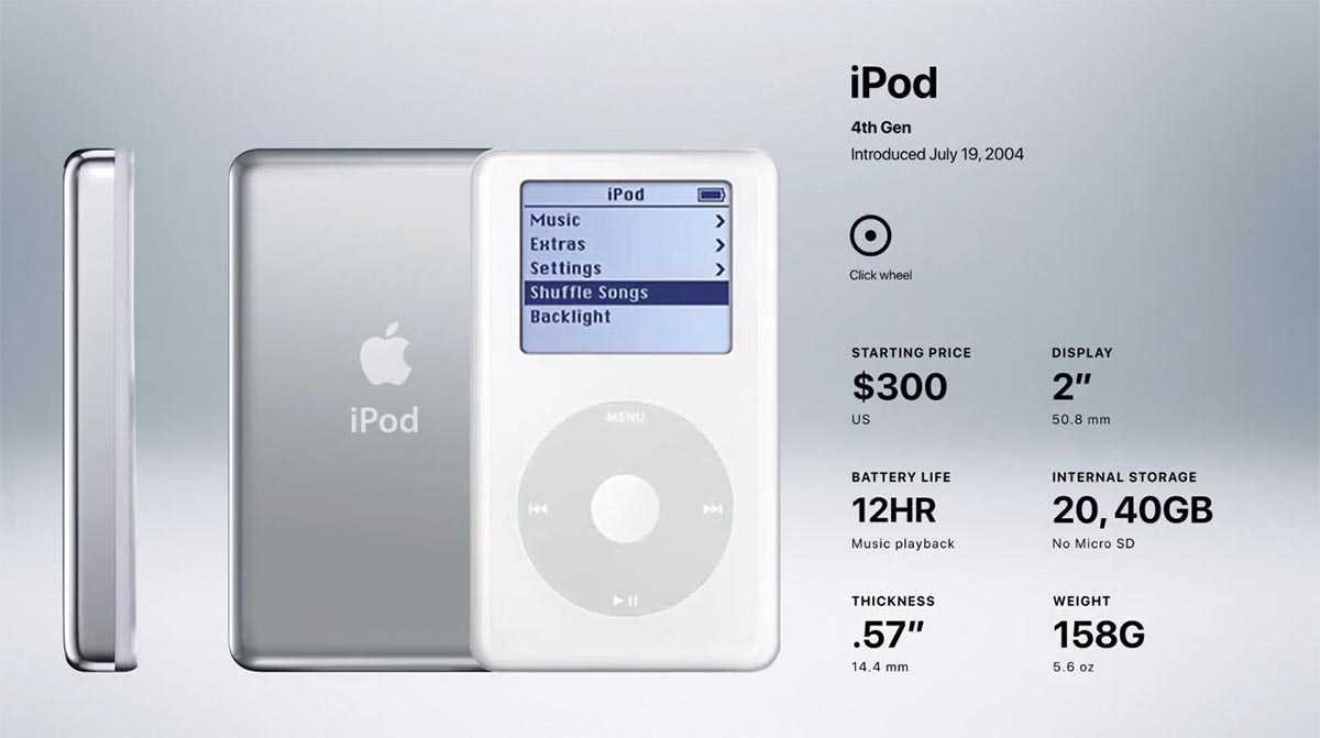 Летом 2004 года был представлен iPod четвертого поколения. Главным отличием от всех предыдущих моделей стало появление блока управления Click Wheel. Инженеры совместили сенсорную панель Touch Wheel с четырьмя кнопками навигации под ней. Это позволило больше не экспериментировать с отдельными клавишами и вывело удобство управления плеером на новый уровень.