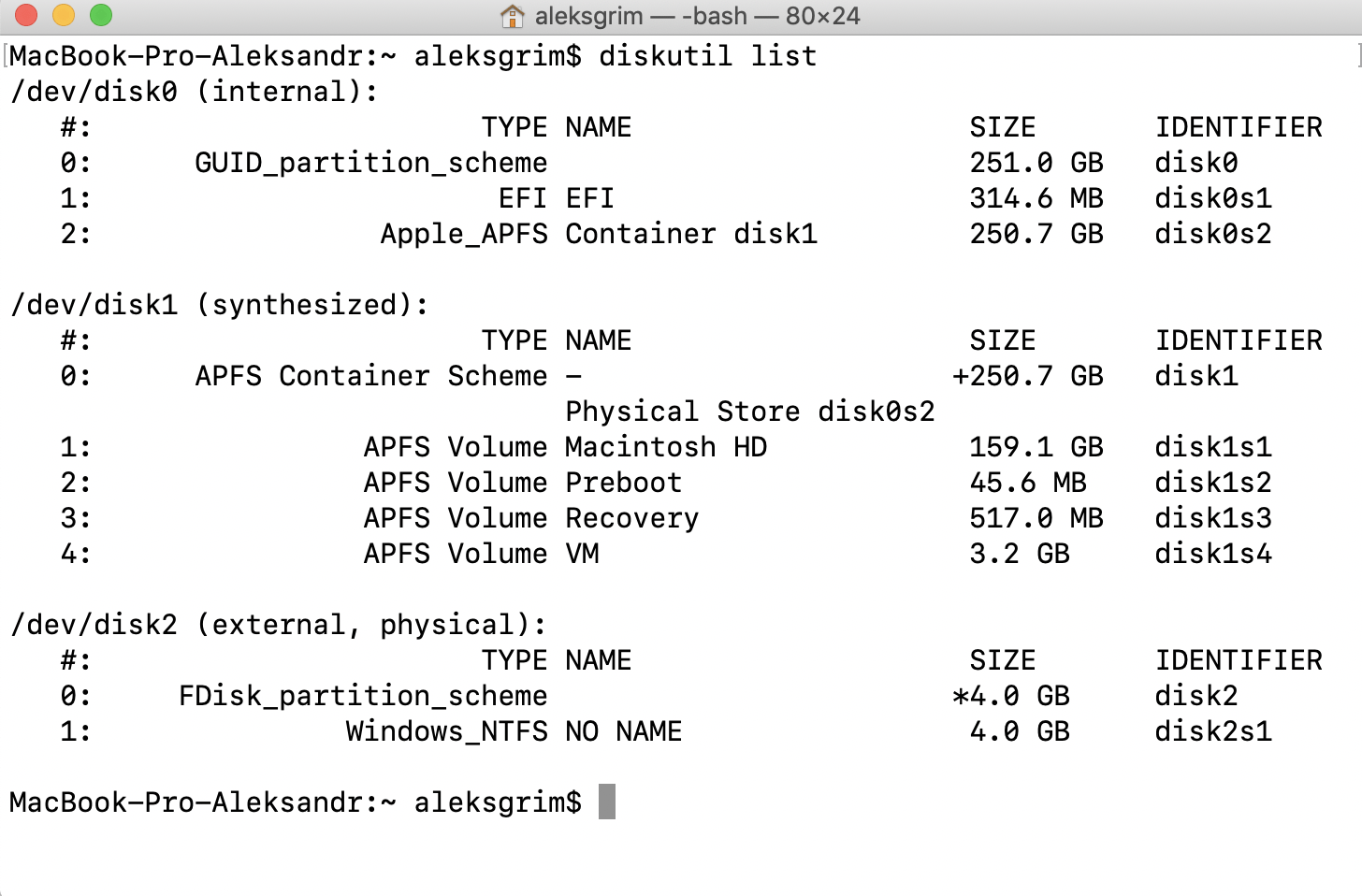 Сперва посмотрим, какой идентификатор у нашей флешки внутри системы. Откройте терминал и задайте следующую команду: diskutil list. Ответом будем примерно такой код.