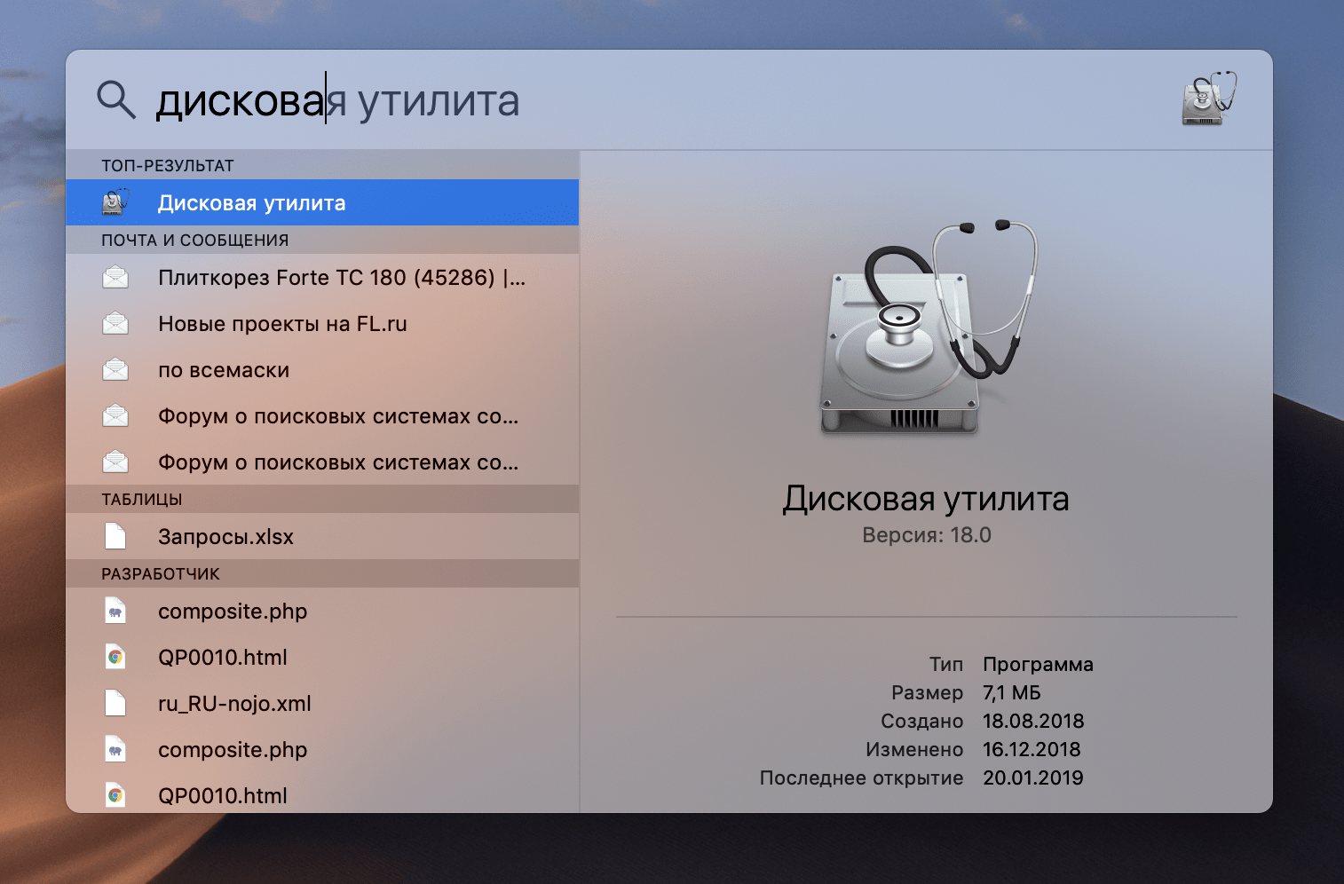 Второй способ запуска дисковой утилиты в разы проще — вызовите Spotlight сочетанием клавиш CMD + Пробел. В появившемся поле начните вводить «дисковая утилита».