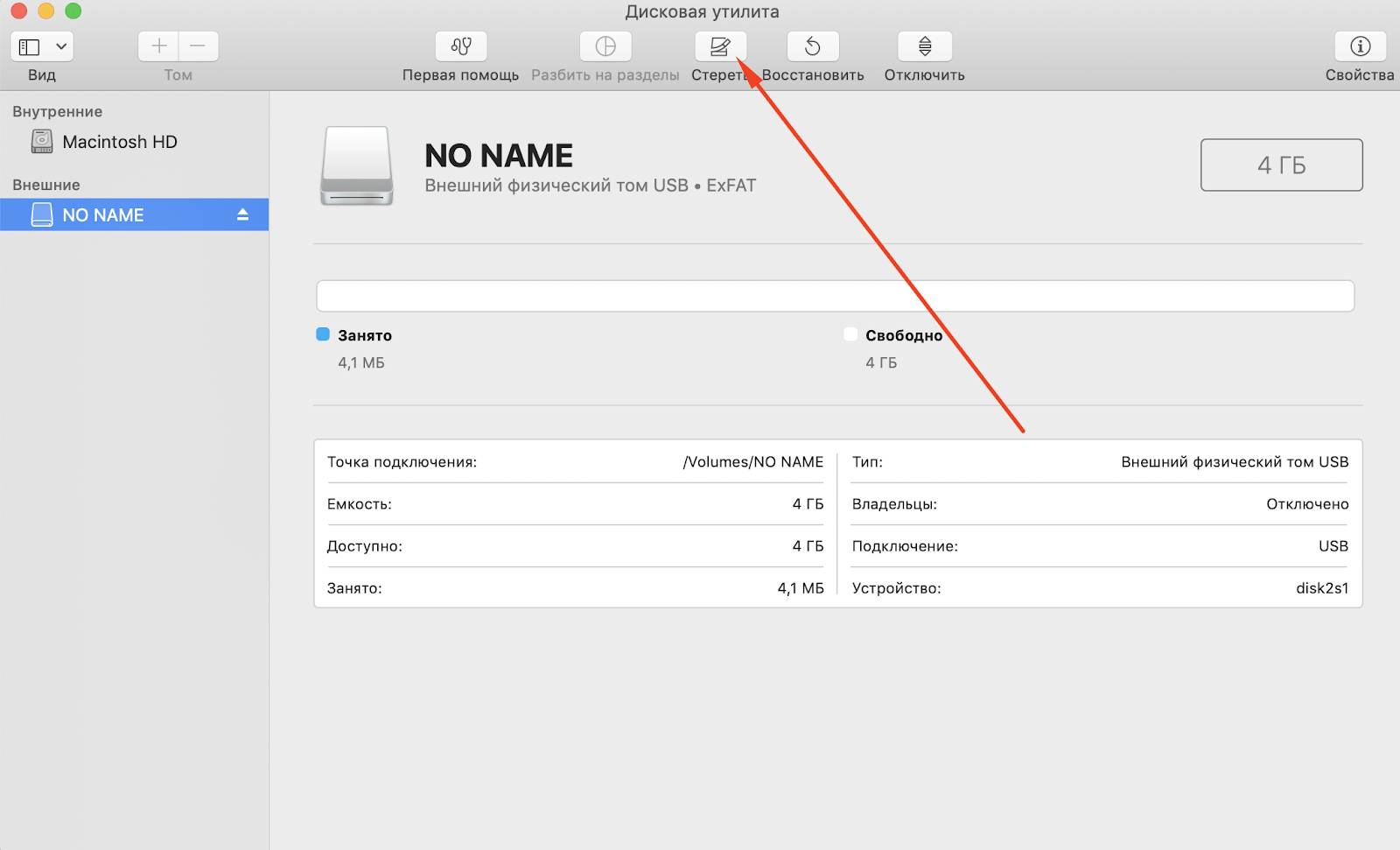 5. Для форматирования, необходимо выбрать нужное устройство и затем в панели сверху нажать «Стереть».