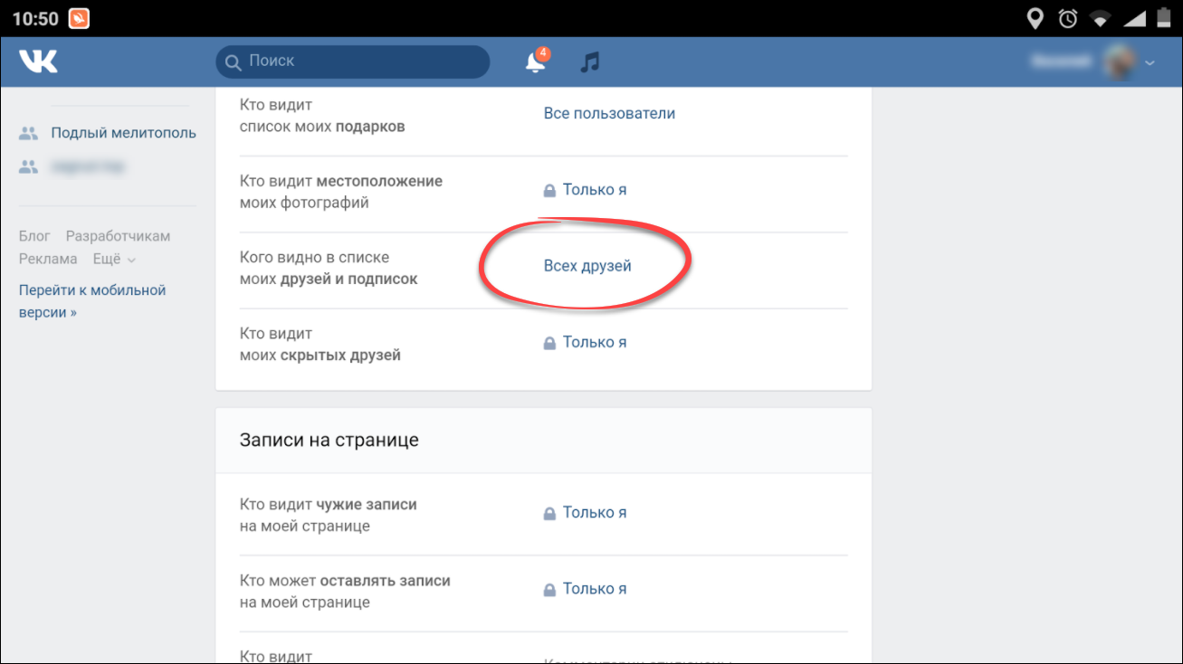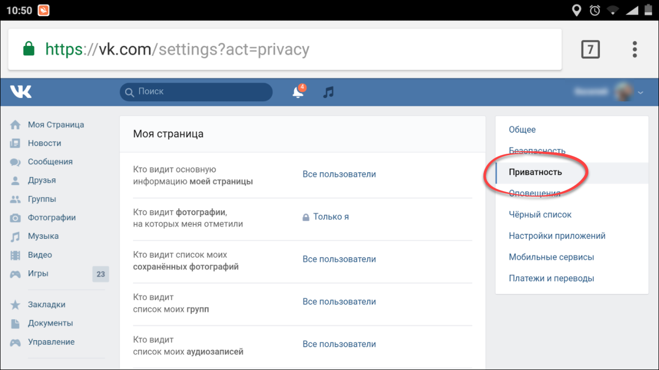 Есть ещё один способ скрыть друзей и подписки с мобильного. Он предполагает использование полной версии ВКонтакте через браузер телефона: