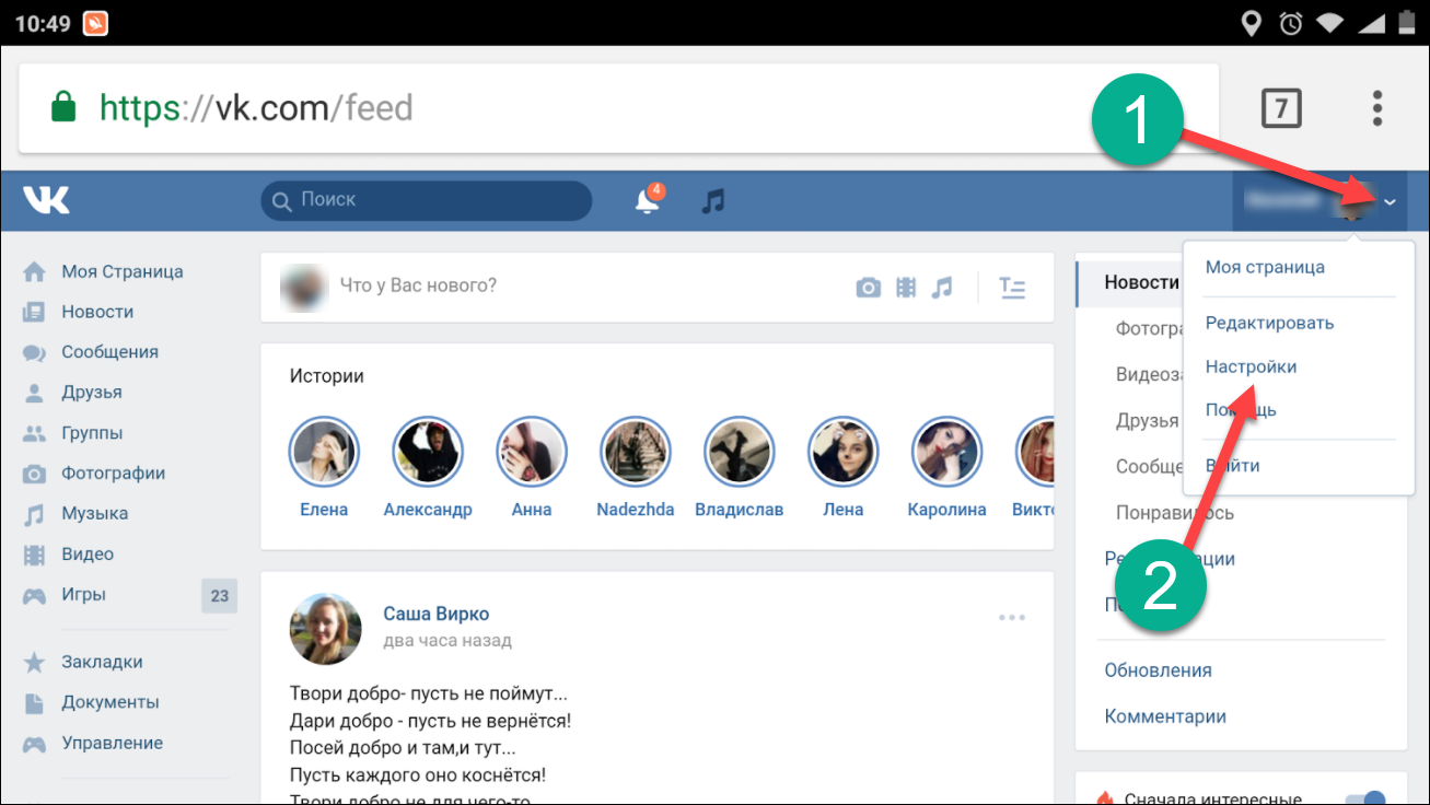 - Мы оказались на полной версии vk.com. В правой верхней части странички есть стрелочка, нажатие по которой вызовет дополнительное меню. В нем нужно выбрать пункт настроек.
