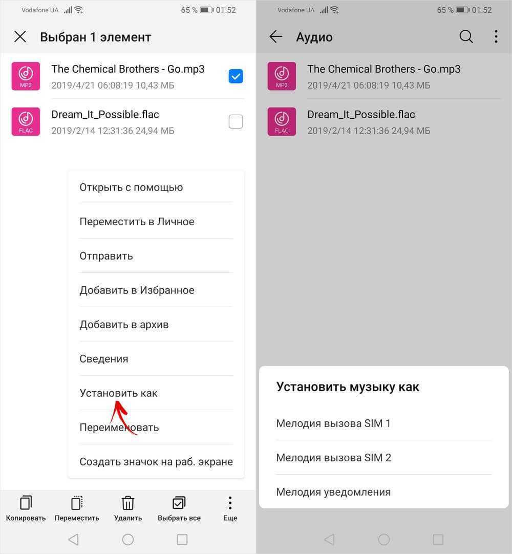 В раскрывшемся меню щелкните по пункту «Установить как», а затем выберите для какой из SIM-карт установить мелодию.