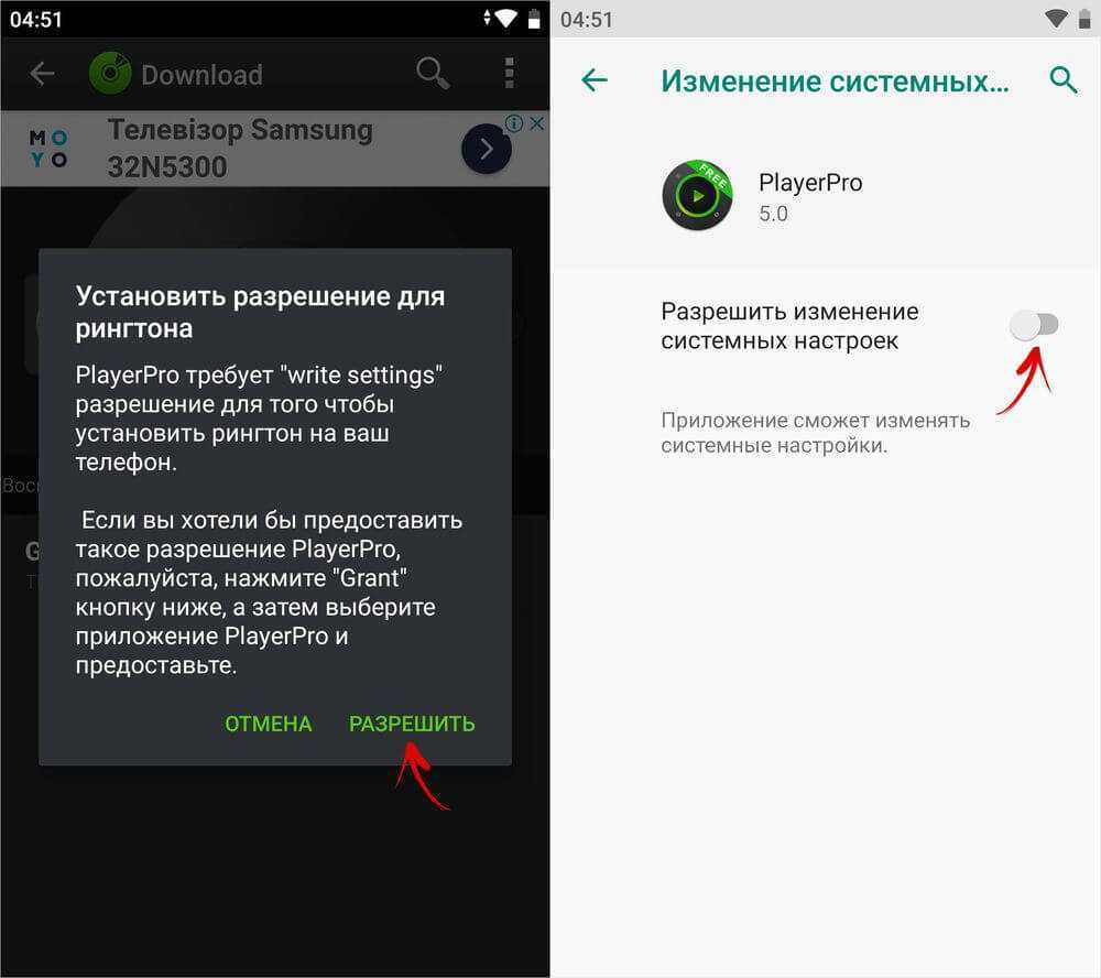 Если потребуется, предоставьте PlayerPro разрешение на внесение изменений в системные настройки: при появлении сообщения нажмите «Разрешить» и активируйте тумблер в открывшемся окне настроек.