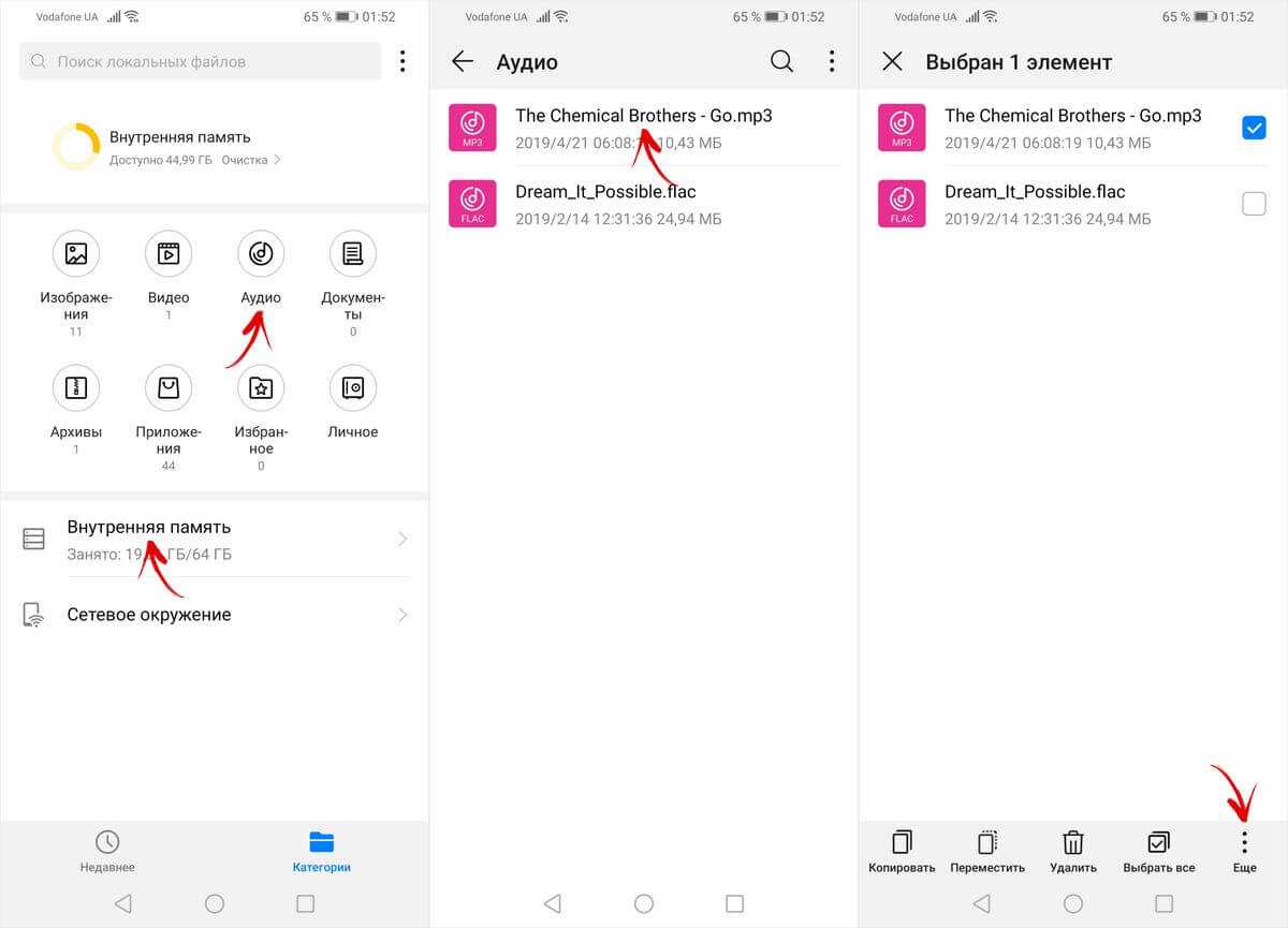 На смартфонах Хуавей и Хонор можно установить загруженную песню в качестве рингтона при помощи стандартной программы Файлы, иконка которой по умолчанию расположена на втором экране (рабочем столе). Зайдите в файловый менеджер и перейдите в раздел «Аудио» либо кликните по пункту «Внутренняя память» и откройте папку, в которой хранится скачанная песня. Выберите трек, удерживая на нем палец, и нажмите кнопку «Еще», расположенную в нижнем правом углу.