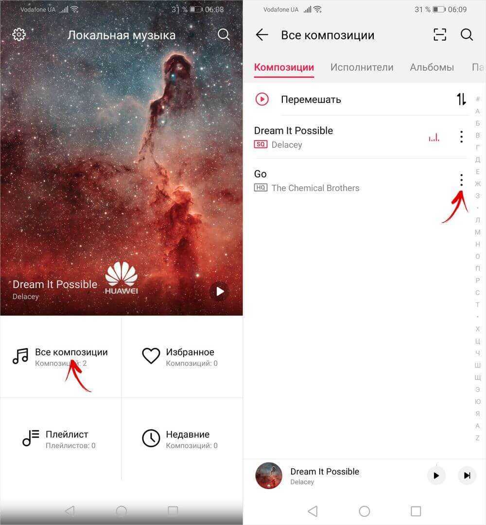 В прошивке EMUI, на которой работают смартфоны Huawei и Honor, предустановлено приложение Музыка. Через него также можно поставить скачанный трек на звонок. Для этого запустите программу, откройте «Все композиции» и кликните на три точки возле любимой песни.