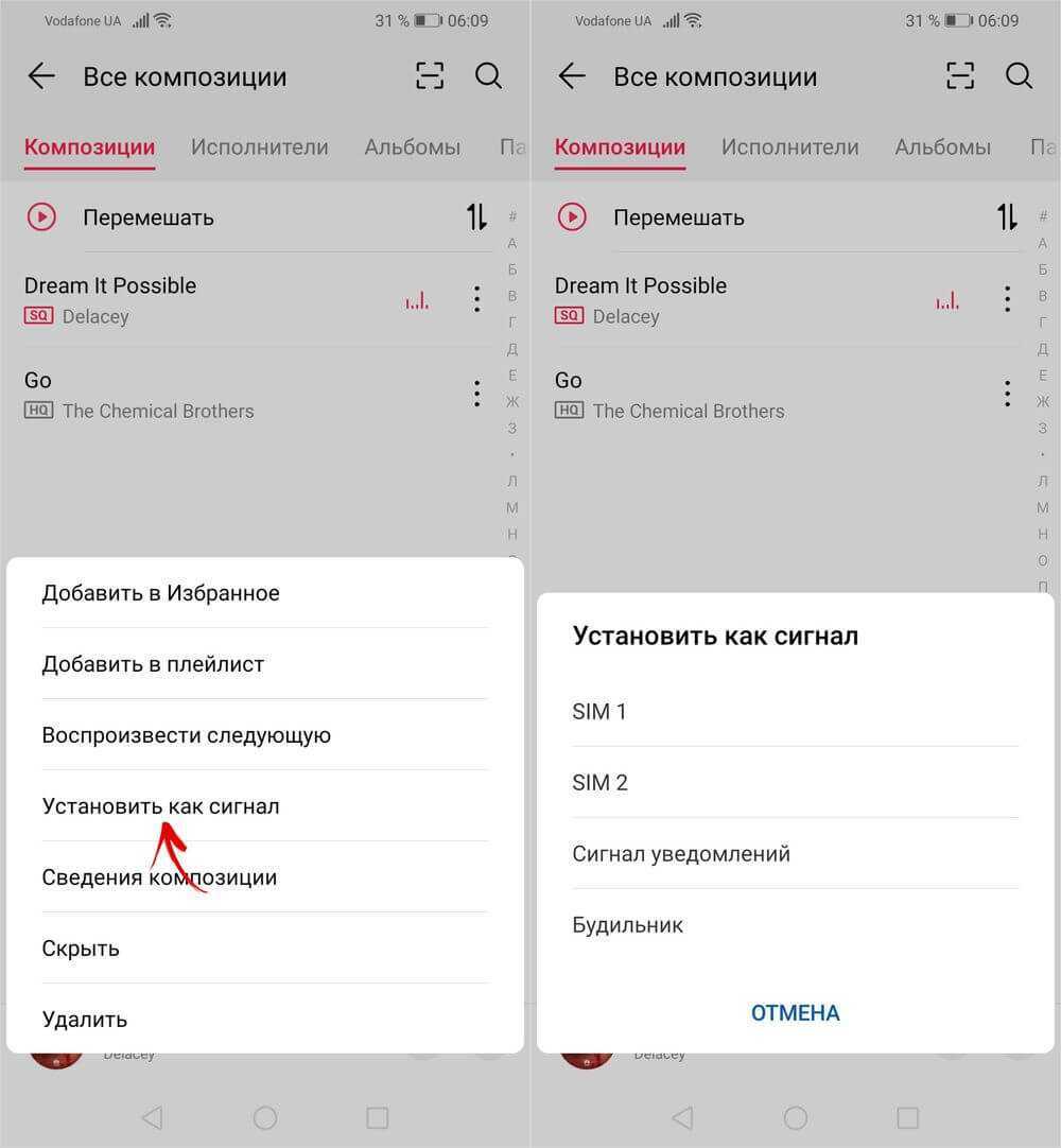 В оболочке EMUI действия похожи. В плеере понадобится нажать «Все композиции», найти песню, открыть дополнительное меню и выбрать опцию «Установить как сигнал». Система попросит выбрать СИМ-карту.