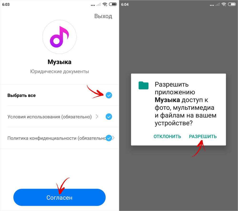 На телефонах Xiaomi и Redmi предустановлено приложение Музыка, при помощи которого можно ставить загруженные композиции на звонок. Для этого зайдите в программу и, если запускаете ее первый раз, согласитесь с условиями использования и политикой конфиденциальности. Также разрешите приложению доступ к фото, мультимедиа и файлам на смартфоне.