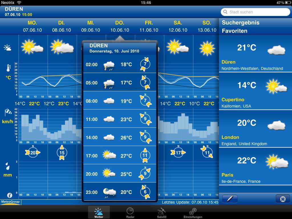 Приложение переведено на 12 языков. Имеет интуитивно понятную панель с доступом к инструментам, таким как дождевой радар и интерактивный график. Можно узнать несколько видов прогнозов: на неделю, на сутки, на каждые три часа. Программа дает доступ ко всем погодным показателям и отдельно предупреждает пользователя о приближении ненастья.