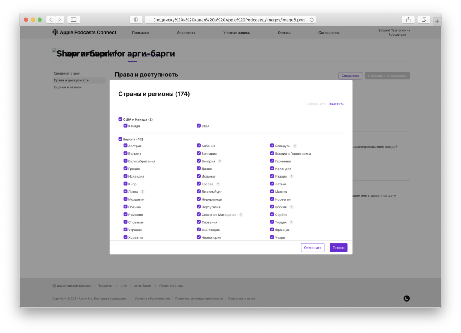 Вы можете настроить доступ к вашему подкасту в разных странах. Для этого на вкладке вашего подкаста перейдите в «Права и доступность». По умолчанию подкаст доступен во всех странах, но вы можете сами выбрать подходящие вам настройки.