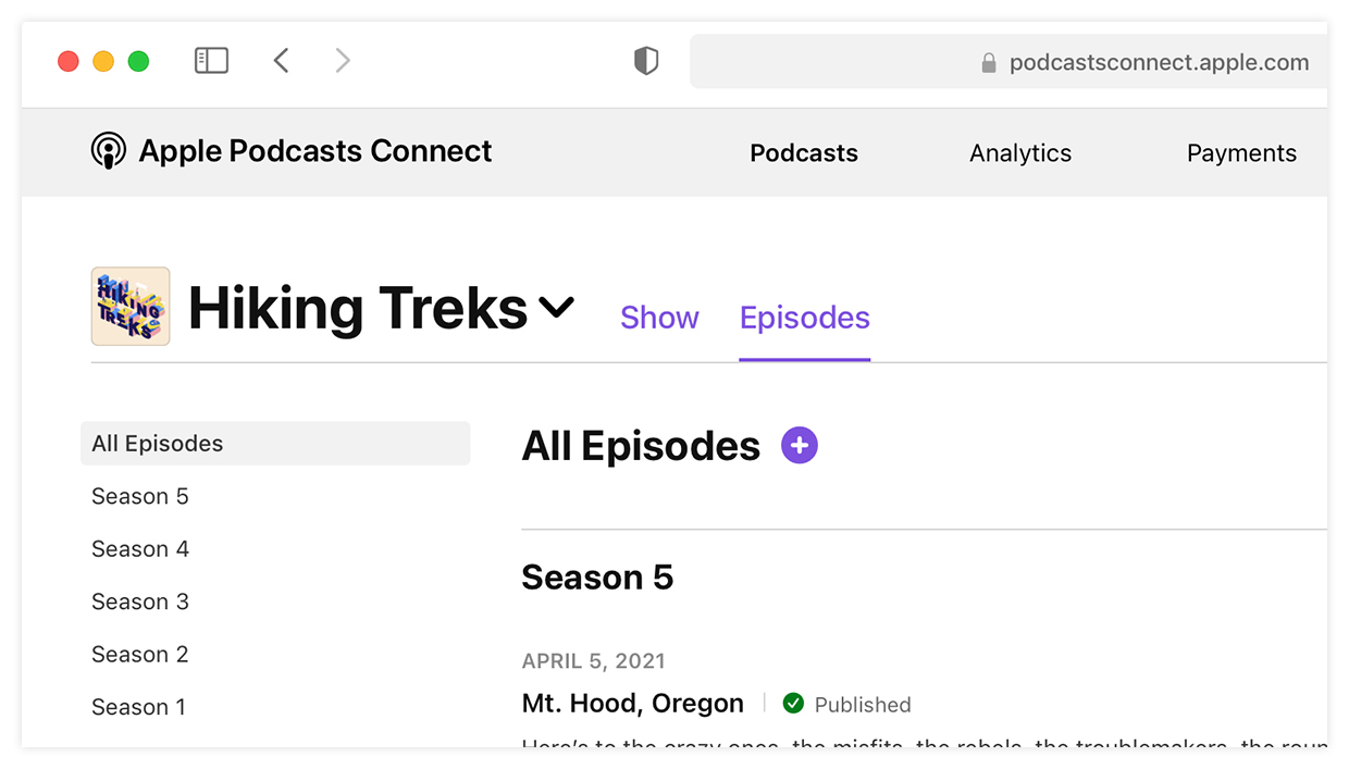 Перейдите на вкладку «Эпизоды» и создайте новый эпизод в Apple Podcast Connect
